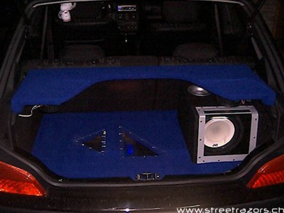 Alpine Headunit, Endstufen: Carpower Wanted 2/150, Velocity. Vorne Alpine 2-Weg, hinten Boss 3-Wegesystem und zu guter letzt noch einen saftigen JVC-Subwoofer mit blauen LED-Effekten... Der Einbau der ganzen Anlage und der Kofferraumausbau raubten mir 3 Tage meiner schönen Ferien und Nerven, Kinder, Kinder hab ich mich genervt..., wobei, so bin ich, der Ausbau gefällt mir nicht, und nächstens werd ich mich wieder mal ans basteln machen |