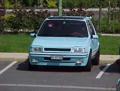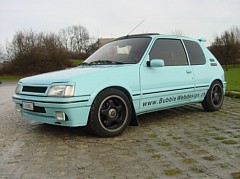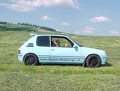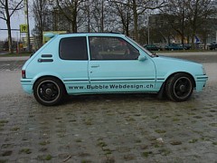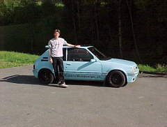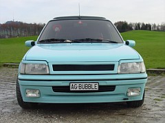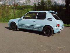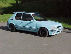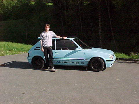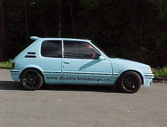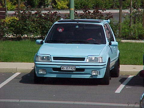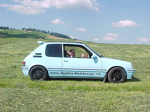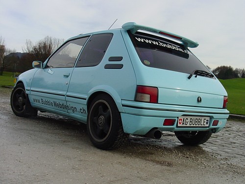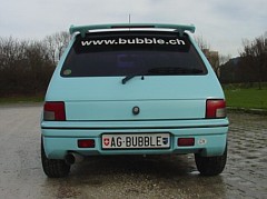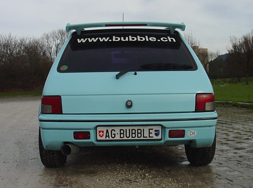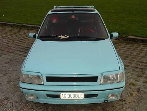 Hellblaue Neulackierung, Ecosse Sportgrill, Scheinwerferblenden und Heckspoiler mit drittem Bremslicht, Remus-Sportauspuff mit Vor- und Endschalldämpfer, getönte Scheiben, www.bubble.ch Aufschrift. |