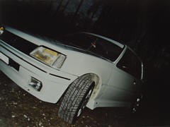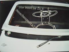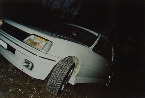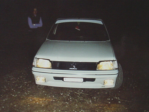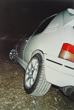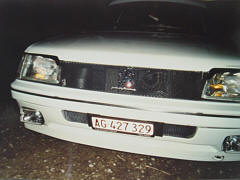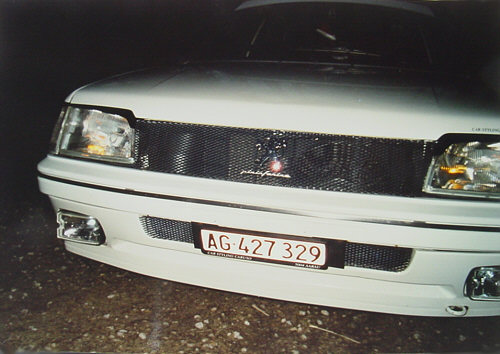 Selbst angefertigtes Kühlergitter mit dem neuen Emblem, Scheinwerferblenden, Heckspoiler hinten, Balken auf Frontscheibe, Seitenschwellen, Diverse Teile in Wagenfarbe lackiert, Ragazzon guppe N Endtopf (nur für Rennzwecke) |